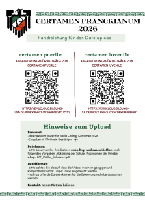 Ich bitte nun ganz herzlich alle Kolleginnen und Kollegen der Fächer Griechisch und Latein, unseren Wettbewerb den Schülerinnen und Schülern bekannt zu machen, die Schülerinnen und Schüler zum Mitmachen zu motivieren und sie danach an den Veranstalter zu melden. Bitte tun Sie dies bis spätestens zum 29. Oktober 2025; für die Anmeldung verwenden Sie bitte das Anmeldeformular, das Sie in der Datei zu den Aufgaben des Certamen Franckianum finden. Die Schülerinnen und Schüler können auf dem Anmeldeformular auch auswählen, ob sie eine Griechisch- oder Latein-Klausur schreiben möchten. (Sie können mir auch zunächst eine E-Mail schicken, die folgende Angaben enthält: Name und Anschrift der Schule, Anzahl der Schülerinnen und Schüler, Angabe der Klausur (Latein oder Griechisch), E-mail an Mies@latina-halle.de; die vollständig ausgefüllten Anmeldeformulare benötige ich aber später auf jeden Fall). Wir werden Ihnen umgehend die Klausuren zuschicken (an Ihre Schule); Schicken Sie danach die Klausuren unkorrigiert an uns zurück – einen frankierten und adressierten Rückumschlag werde ich beilegen. Spätestens Mitte Dezember werden wir dann alle Teilnehmerinnen und Teilnehmer informieren, welche die nächsten Runde, in der eine Hausarbeit zu einem der vorgegebenen Themen geschrieben werden muss, erreicht haben.