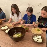 Die KOCH-GANG teilte sich auch in mehrere Grüppchen auf; ein paar schnippelten mit tränenden Augen Zwiebeln, andere haben sogar rohes Fleisch geschnitten. Zwiebeln und Fleisch waren später für den Fleischeintopf. Wieder andere aus der KOCH-GANG haben Kräuter für einen Quark geschnitten.