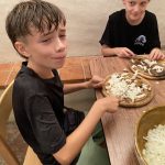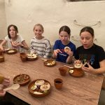 Später beim Essen gab es den süßen Fleischeintopf, eine kompliziert zu beschreibende Eierpampe, natürlich die Fladenbrote, dazu den Quark, etwas Obst und Traubensaft. Eigentlich hat allen das Essen geschmeckt. Danach war der Abwasch dran. Wir sangen dabei schöne Lieder aus dem Musikunterricht der fünften Klasse und hatten viel Spaß dabei.